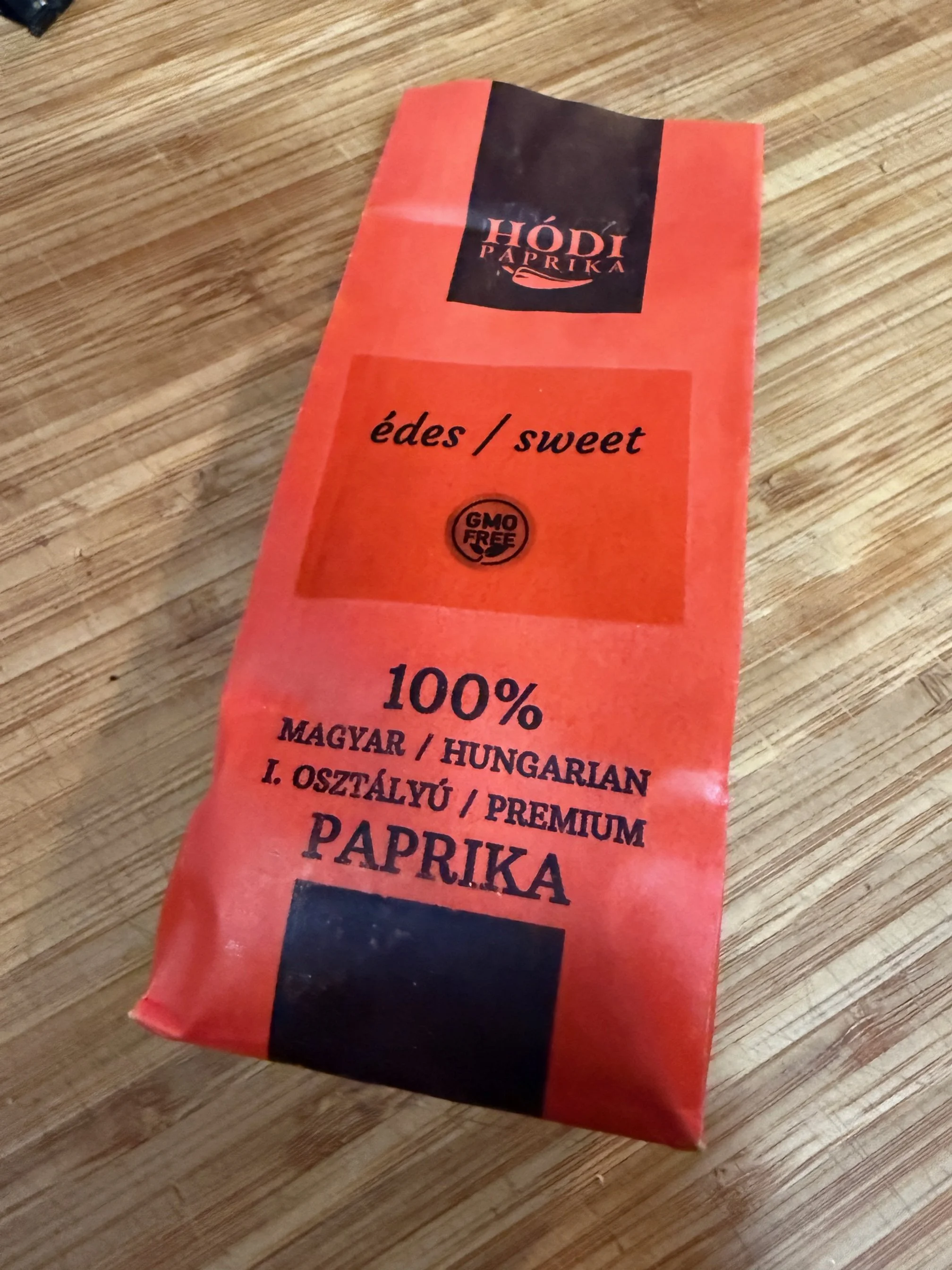 Paprika is complicated. At the minimum, it's important to know that Hungarian Paprika comes in both hot and sweet versions. If you are not a big fan of hot (csípős) you will reach for sweet (csemege). (Or use both adding a bit of the hot to the sweet.) "Sweet" simply means not hot - it does not mean 'sweet', as in sugar. Although... this natural product made from dried chili/red peppers does have a somewhat high sugar content, causing it to burn easily when added to a hot pan. The colour becomes dark and the flavour bitter, so the rule of thumb is to take the pot off the heat briefly when adding the paprika powder. Return it to the heat after a few stirs.